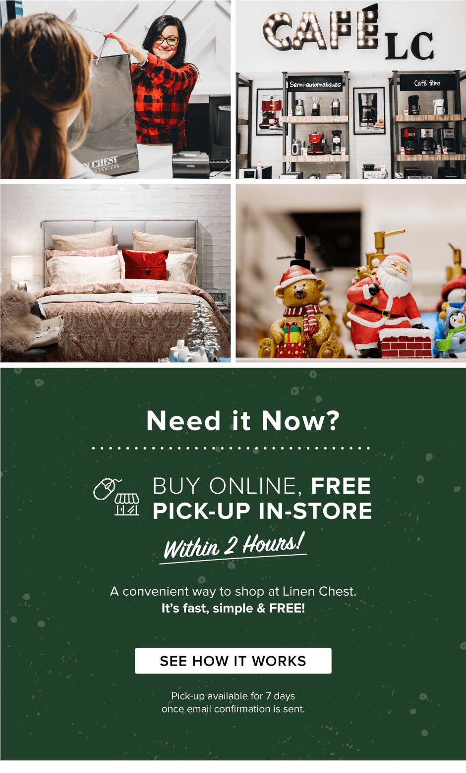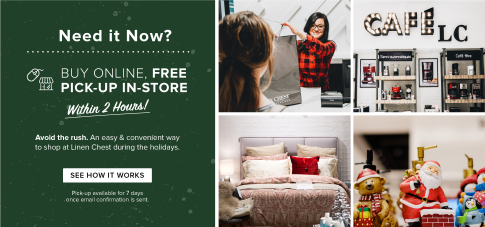 On the product page, click on the link Check in stores (near the Add to Cart button). A window will open with the list of Linen Chest stores. If the message “Pick-up Not Available” or “Not in Stock” is indicated, you cannot order this item for in-store pick-up. You have the option of checking another store to see if they offer the service for this product.