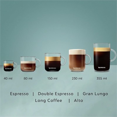 Unlock a world of coffee possibilities with five distinct cup sizes. Whether you crave an intense espresso (40 ml/1.35 oz), a comforting gran lungo, or a generous alto (414 ml/14 oz), your Nespresso Vertuo POP+ delivers. Experience the convenience of unparalleled beverage versatility, all with a single touch.