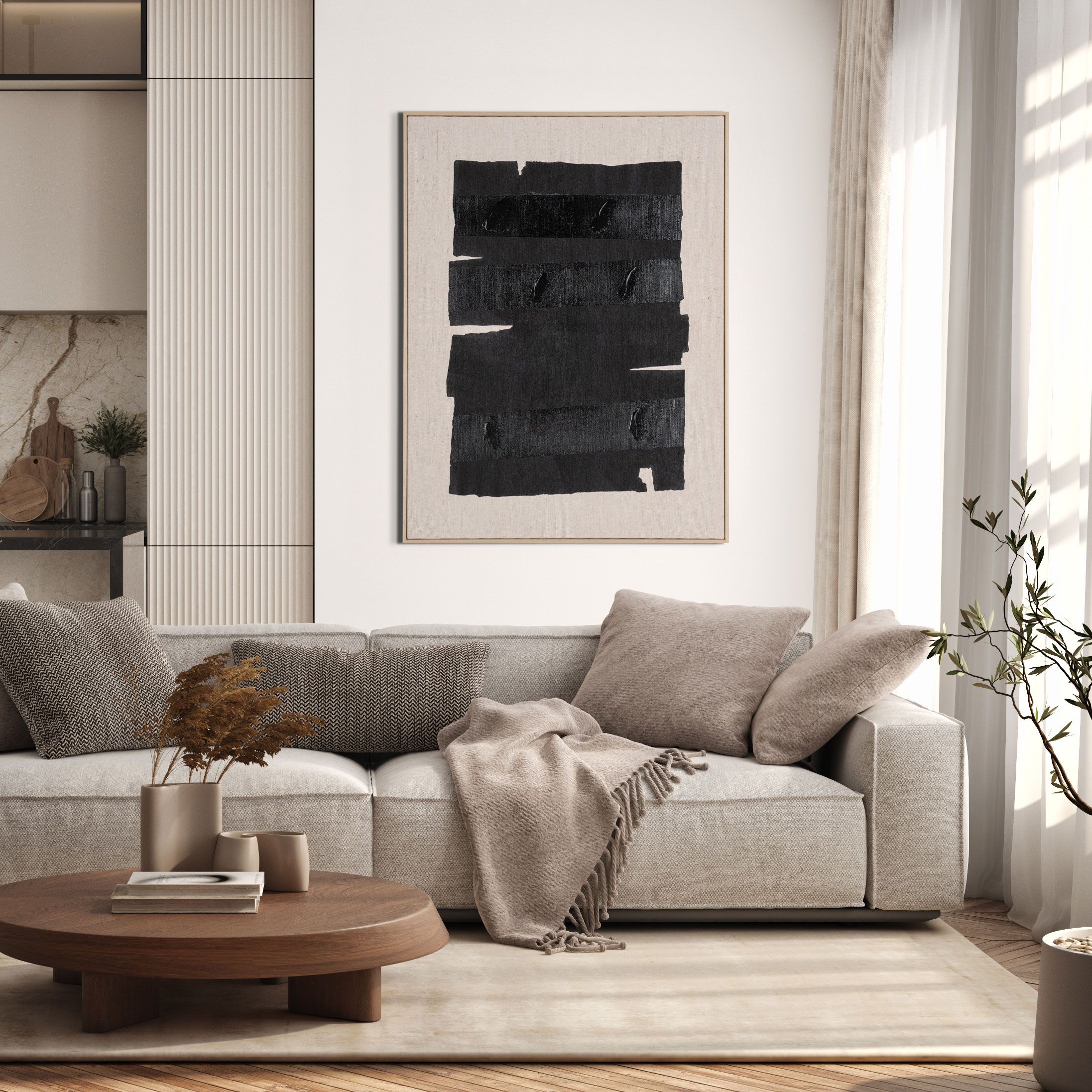 - Textured black strokes on natural linen create striking visual depth.