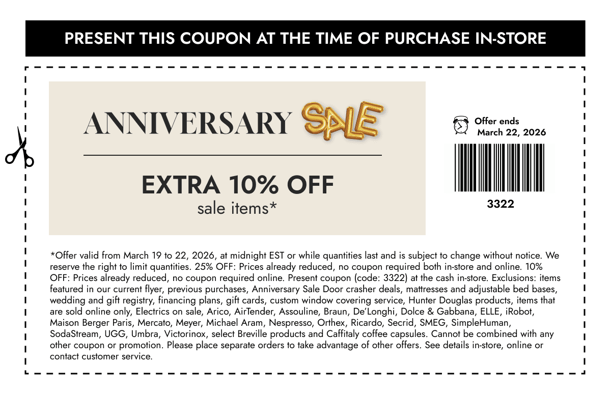 *Offer valid from March 19 to 22, 2026, at midnight EST or while quantities last and is subject to change without notice. We reserve the right to limit quantities. 25% OFF: Prices already reduced, no coupon required both in-store and online. 10% OFF: Prices already reduced, no coupon required online. Present coupon (code: 3322) at the cash in-store. Exclusions: items featured in our current flyer, previous purchases, Anniversary Sale Door crasher deals, mattresses and adjustable bed bases, wedding and gift registry, financing plans, gift cards, custom window covering service, Hunter Douglas products, items that are sold online only, Electrics on sale, Arico, AirTender, Assouline, Braun, De’Longhi, Dolce & Gabbana, ELLE, iRobot, Maison Berger Paris, Mercato, Meyer, Michael Aram, Nespresso, Orthex, Ricardo, Secrid, SMEG, SimpleHuman, SodaStream, UGG, Umbra, Victorinox, select Breville products and Caffitaly coffee capsules. Cannot be combined with any other coupon or promotion. Please place separate orders to take advantage of other offers.
