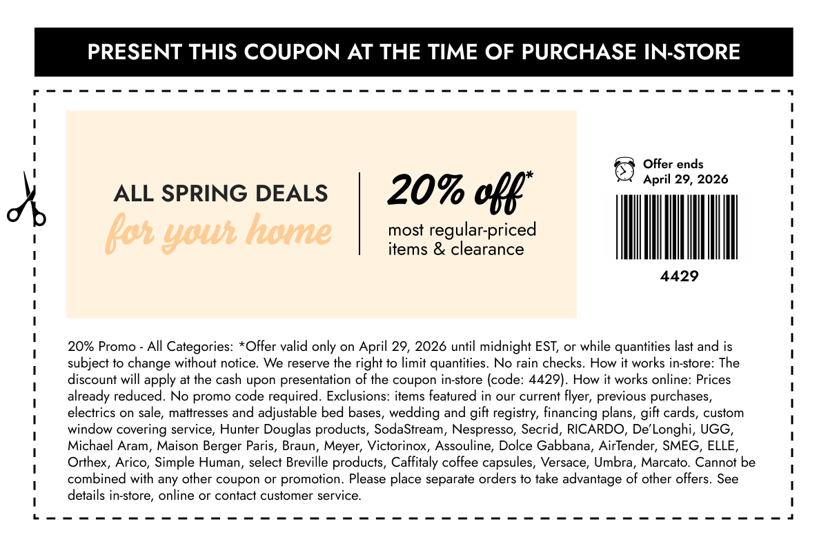 20% Promo - All Categories: *Offer valid only on April 29, 2026 at midnight EST, or while quantities last and is subject to change without notice. We reserve the right to limit quantities. No rain checks. How it works in-store: The discount will apply at the cash upon presentation of the coupon in-store (code: 4429). How it works online: Prices already reduced. No promo code required. Exclusions: items featured in our current flyer, previous purchases, electrics on sale, mattresses and adjustable bed bases, wedding and gift registry, financing plans, gift cards, custom window covering service, Hunter Douglas products, SodaStream, Nespresso, Secrid, RICARDO, De’Longhi, UGG, Michael Aram, Maison Berger Paris, Braun, Meyer, Victorinox, Assouline, Dolce Gabbana, AirTender, SMEG, ELLE, Orthex, Arico, Simple Human, select Breville products, Caffitaly coffee capsules, Versace, Umbra, Marcato. Cannot be combined with any other coupon or promotion. Please place separate orders to take advantage of other offers.