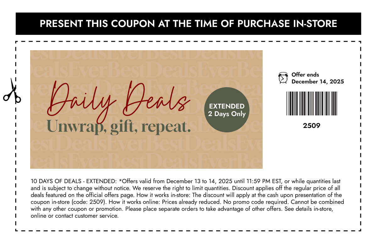 DAILY DEALS - EXTENDED: *Offers valid from December 13 to 14, 2025 until 11:59 PM EST, or while quantities last and is subject to change without notice. We reserve the right to limit quantities. Discount applies off the regular price of all deals featured on the official offers page. How it works in-store: The discount will apply at the cash upon presentation of the coupon in-store (code: 2509). How it works online: Prices already reduced. No promo code required. Cannot be combined with any other coupon or promotion. Please place separate orders to take advantage of other offers.