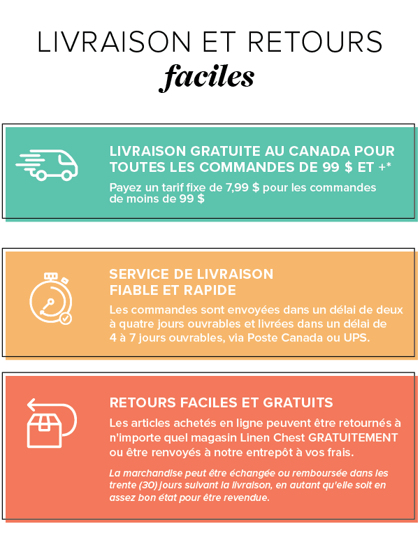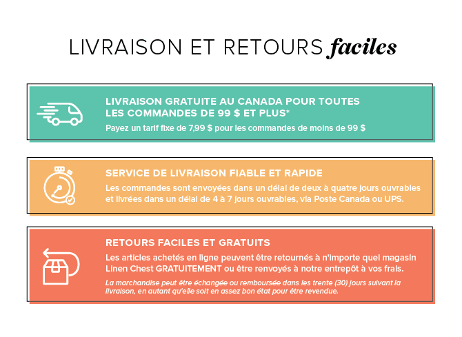 Nous livrons gratuitement dans un rayon de 50 km de chacun de nos magasins. Si vous désirez confirmer une adresse de livraison, ou obtenir un devis des frais de livraison pour un endroit excédant ce rayon, veuillez communiquer avec nous en écrivant à info@linenchest.com.