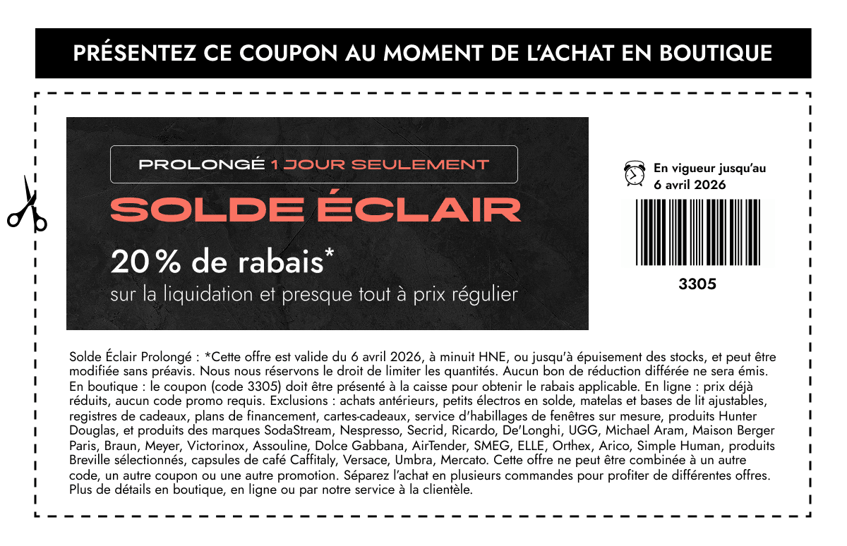 Solde Éclair Prolongé : *Cette offre est valide le 6 avril 2026, à minuit HNE, ou jusqu'à épuisement des stocks, et peut être modifiée sans préavis. Nous nous réservons le droit de limiter les quantités. Aucun bon de réduction différée ne sera émis. En boutique : le coupon (code 3305) doit être présenté à la caisse pour obtenir le rabais applicable. En ligne : prix déjà réduits, aucun code promo requis. Exclusions : achats antérieurs, petits électros en solde, matelas et bases de lit ajustables, registres de cadeaux, plans de financement, cartes-cadeaux, service d'habillages de fenêtres sur mesure, produits Hunter Douglas, et produits des marques SodaStream, Nespresso, Secrid, Ricardo, De'Longhi, UGG, Michael Aram, Maison Berger Paris, Braun, Meyer, Victorinox, Assouline, Dolce Gabbana, AirTender, SMEG, ELLE, Orthex, Arico, Simple Human, produits Breville sélectionnés, capsules de café Caffitaly, Versace, Umbra, Marcato. Cette offre ne peut être combinée à un autre code, un autre coupon ou une autre promotion. Séparez l’achat en plusieurs commandes pour profiter de différentes offres.