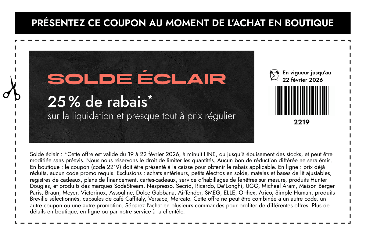 Solde Éclair : *Cette offre est valide du 19 à 22 février 2026, à minuit HNE, ou jusqu'à épuisement des stocks, et peut être modifiée sans préavis. Nous nous réservons le droit de limiter les quantités. Aucun bon de réduction différée ne sera émis. En boutique : le coupon (code 2219) doit être présenté à la caisse pour obtenir le rabais applicable. En ligne : prix déjà réduits, aucun code promo requis. Exclusions : achats antérieurs, petits électros en solde, matelas et bases de lit ajustables, registres de cadeaux, plans de financement, cartes-cadeaux, service d'habillages de fenêtres sur mesure, produits Hunter Douglas, et produits des marques SodaStream, Nespresso, Secrid, Ricardo, De'Longhi, UGG, Michael Aram, Maison Berger Paris, Braun, Meyer, Victorinox, Assouline, Dolce Gabbana, AirTender, SMEG, ELLE, Orthex, Arico, Simple Human, produits Breville sélectionnés, capsules de café Caffitaly, Versace, Mercato. Cette offre ne peut être combinée à un autre code, un autre coupon ou une autre promotion. Séparez l’achat en plusieurs commandes pour profiter de différentes offres.