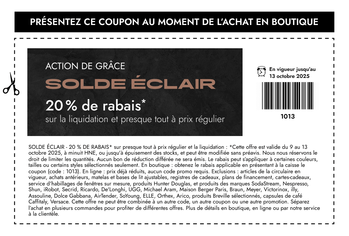 SOLDE ÉCLAIR - 20 % DE RABAIS* sur presque tout à prix régulier et la liquidation : *Cette offre est valide du 9 au 13 octobre 2025, à minuit HNE, ou jusqu'à épuisement des stocks, et peut être modifiée sans préavis. Nous nous réservons le droit de limiter les quantités. Aucun bon de réduction différée ne sera émis. Le rabais peut s’appliquer à certaines couleurs, tailles ou certains styles sélectionnés seulement. En boutique : obtenez le rabais applicable en présentant à la caisse le coupon (code : 1013). En ligne : prix déjà réduits, aucun code promo requis. Exclusions : articles de la circulaire en vigueur, achats antérieurs, petits électros en solde, matelas et bases de lit ajustables, registres de cadeaux, plans de financement, cartes-cadeaux, service d'habillages de fenêtres sur mesure, produits Hunter Douglas, et produits des marques SodaStream, Nespresso, Shun, iRobot, Secrid, Ricardo, De'Longhi, UGG, Michael Aram, Maison Berger Paris, Braun, Meyer, Victorinox, Assouline, Dolce Gabbana, AirTender, SMEG, ELLE, Orthex, Arico, produits Breville sélectionnés, capsules de café Caffitaly, Versace, Mercato. Cette offre ne peut être combinée à un autre code, un autre coupon ou une autre promotion. Séparez l’achat en plusieurs commandes pour profiter de différentes offres. Plus de détails en boutique, en ligne ou par notre service à la clientèle.