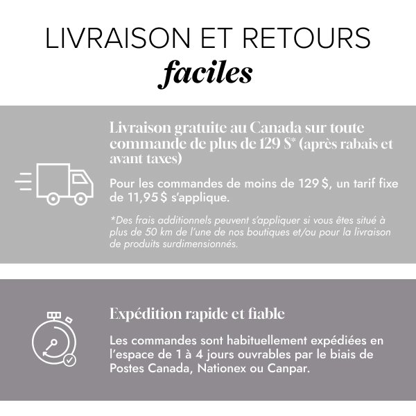 * Veuillez noter que vous êtes responsable des frais d’expédition associés au retour de vos articles à l’exception d’un défaut de fabrication ou d’une erreur de notre part. Pour plus d’information, contactez notre service à la clientèle