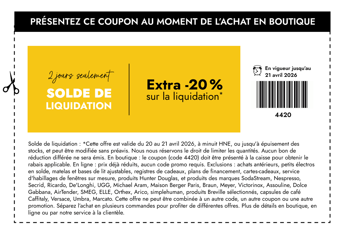 Solde de liquidation : *Cette offre est valide du 20 au 21 avril 2026, à minuit HNE, ou jusqu'à épuisement des stocks, et peut être modifiée sans préavis. Nous nous réservons le droit de limiter les quantités. Aucun bon de réduction différée ne sera émis. En boutique : le coupon (code 4420) doit être présenté à la caisse pour obtenir le rabais applicable. En ligne : prix déjà réduits, aucun code promo requis. Exclusions : achats antérieurs, petits électros en solde, matelas et bases de lit ajustables, registres de cadeaux, plans de financement, cartes-cadeaux, service d'habillages de fenêtres sur mesure, produits Hunter Douglas, et produits des marques SodaStream, Nespresso, Secrid, Ricardo, De'Longhi, UGG, Michael Aram, Maison Berger Paris, Braun, Meyer, Victorinox, Assouline, Dolce Gabbana, AirTender, SMEG, ELLE, Orthex, Arico, simplehuman, produits Breville sélectionnés, capsules de café Caffitaly, Versace, Umbra, Marcato. Cette offre ne peut être combinée à un autre code, un autre coupon ou une autre promotion. Séparez l’achat en plusieurs commandes pour profiter de différentes offres.