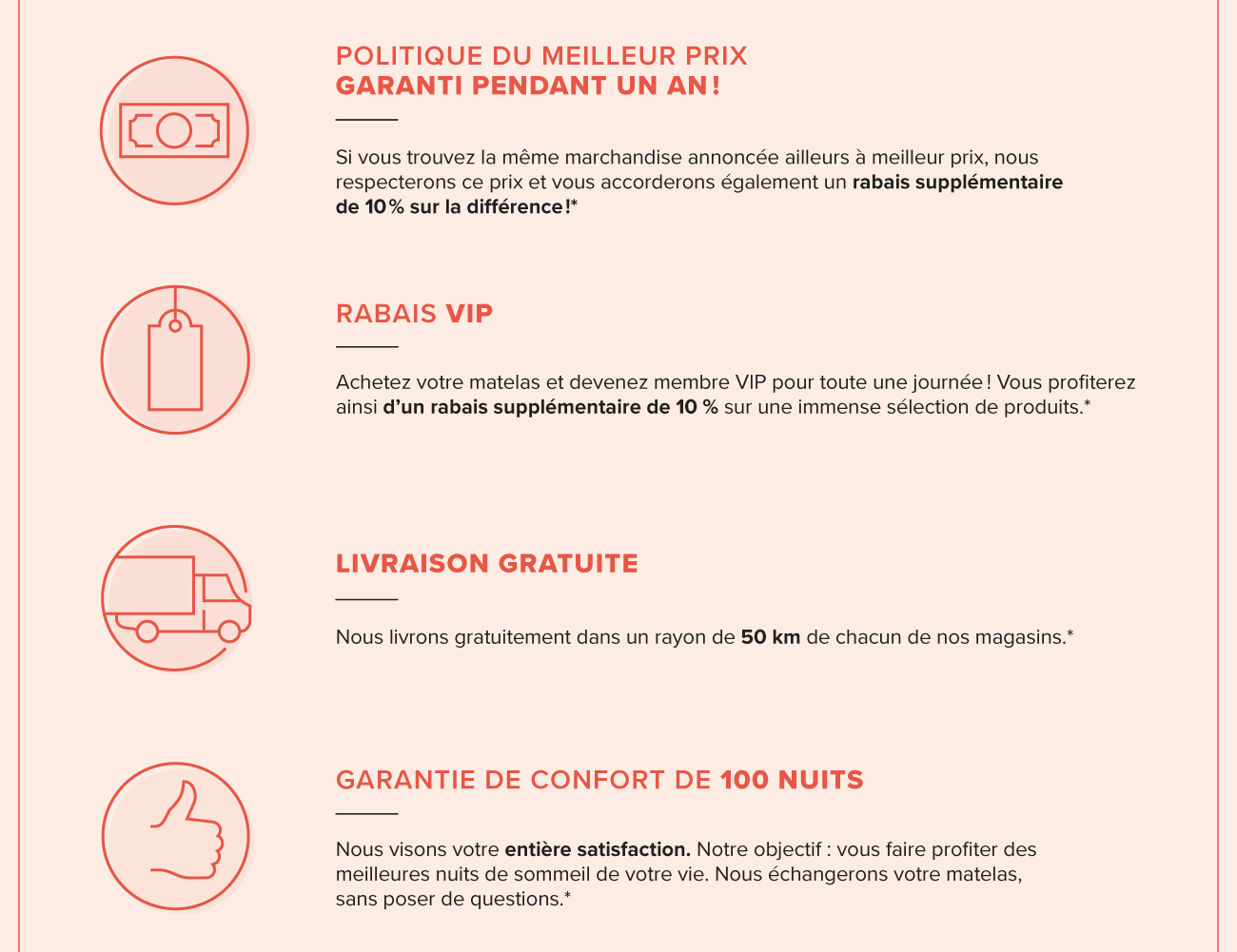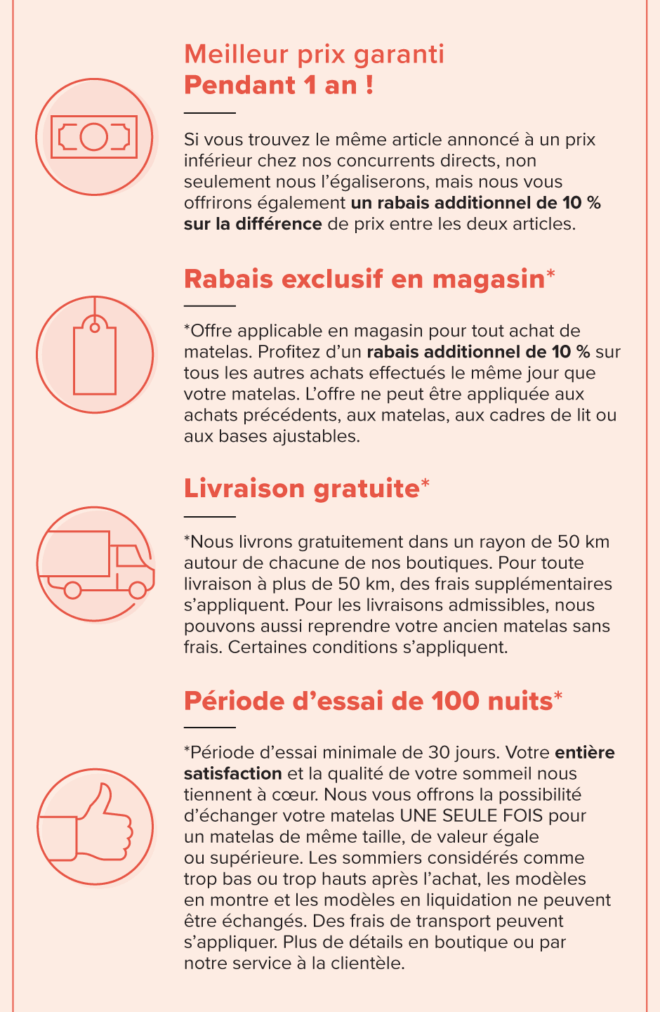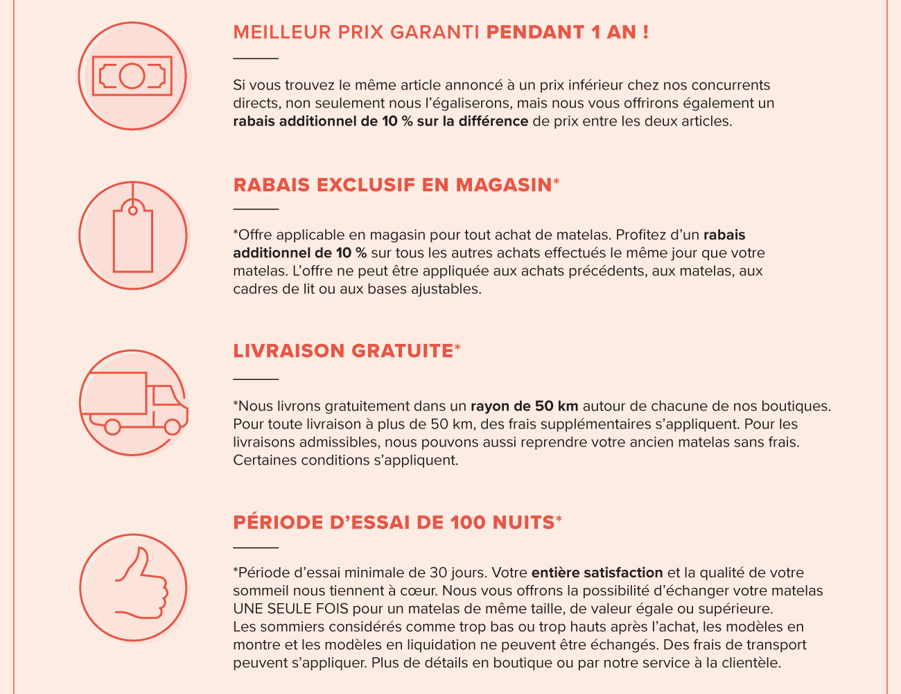 *Des conditions et frais additionnels peuvent s'appliquer à certaines régions ou certains territoires. Nous nous réservons le droit d'annuler ou de modifier cette garantie sans préavis. Cette garantie ne s'applique pas aux bases ajustables, sommiers individuels, modèles en montre et en liquidation, têtes de lit sur mesure, ni aux retours non conformes aux garanties du fabricant de Simmons, Beautyrest ou Tempur-Pedic. Les échanges pour une hauteur de sommier différente ne seront pas acceptés. Plus de détails en boutique.