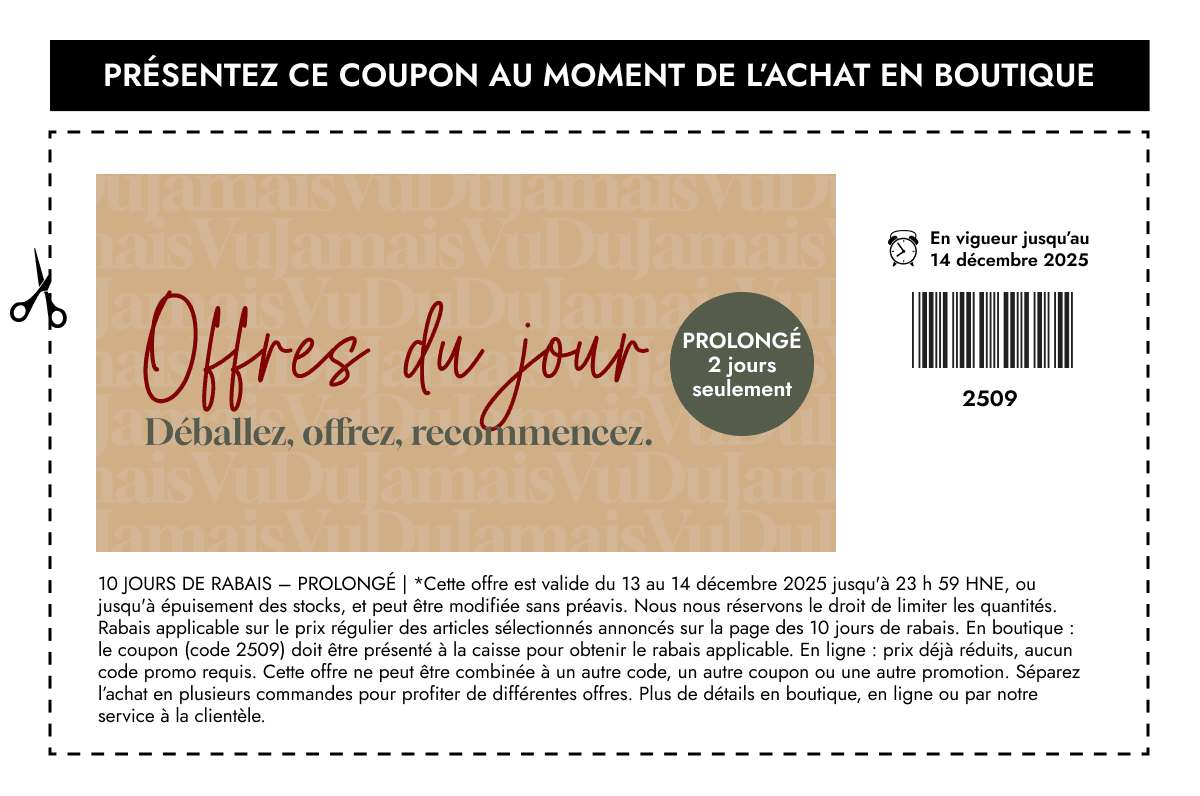 OFFRES DU JOUR – PROLONGÉ | *Cette offre est valide du 13 au 14 décembre 2025 jusqu'à 23 h 59 HNE, ou jusqu'à épuisement des stocks, et peut être modifiée sans préavis. Nous nous réservons le droit de limiter les quantités. Rabais applicable sur le prix régulier des articles sélectionnés annoncés sur la page des OFFRES DU JOUR. En boutique : le coupon (code 2509) doit être présenté à la caisse pour obtenir le rabais applicable. En ligne : prix déjà réduits, aucun code promo requis. Cette offre ne peut être combinée à un autre code, un autre coupon ou une autre promotion. Séparez l’achat en plusieurs commandes pour profiter de différentes offres.